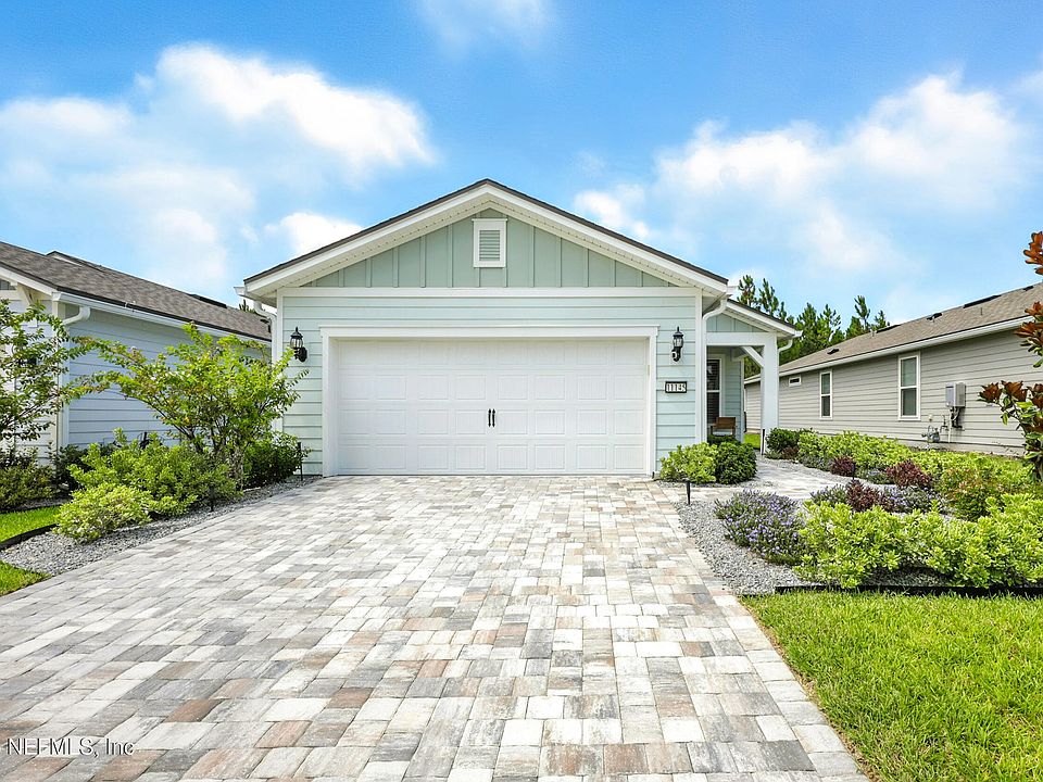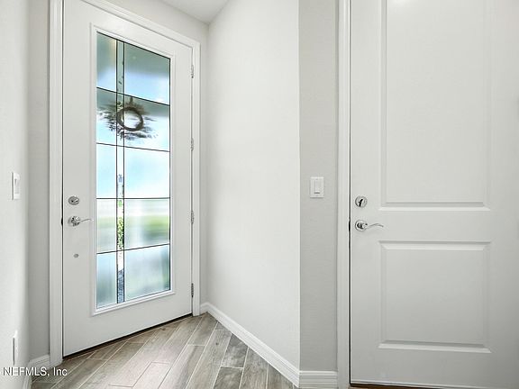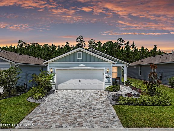 Experience low-maintenance luxury in this immaculate 2BR/2BA home in the gated 55+ Del Webb ETown community. This 1,348 sq ft gem features a decorative glass front door, front porch, and double barn doors leading to a flex room—perfect for an office or guest space. The open floorplan showcases a stunning kitchen with tall white cabinets, quartz countertops, gas cooktop with exterior vent hood, and a glass tile backsplash. Enjoy upgraded lighting, ceiling fans, plantation shutters, and blackout shades in bedrooms. The split-bedroom layout includes a spacious primary suite with a walk-in closet, quartz double vanity, and seated shower. Relax on the screened porch with peaceful preserve views. Includes a laundry room with both electric and gas dryer hookups. Resort-style amenities complete the picture! Del Webb eTown offers an exceptional lifestyle with resort-style amenities designed to keep you active, social, and engaged. The state-of-the-art Clubhouse is the heart of the community, hosting a wide range of activities including food truck nights, lively parties, and live entertainment. Stay fit and healthy with access to a fully equipped Fitness Center, take a dip in the sparkling resort-style pool, or meet friends for a match at the Tennis or Pickleball courts. Pet lovers will enjoy the on-site Dog Park, and green thumbs can tend to their own space in the beautifully maintained Neighborhood Garden. This thoughtfully designed, gated 55+ community features well-constructed homes set within quiet, beautifully landscaped surroundingsoffering both security and peace of mind. Ideally located just a mile from grocery stores, shops, and restaurants, and within a 30-minute drive to the beach. Conveniently nestled between Durbin Pavilion and St. Johns Town Center for premier shopping, dining, and entertainment. Welcome HOME!