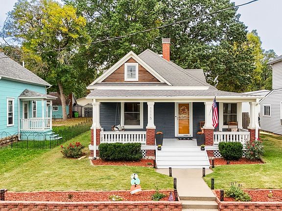 WHAT A COMPLETE CHARMER! This 2 bed, 1 bath home is filled with warmth, character, beauty, a perfect blend of new and old and truly great spaces. The dreamy front porch greets you and asks you to sit a spell. The moment you step into the entry you feel invited into this lovely home. The room sizes are spacious and effortlessly flow into each other. The dining room boasts of the beautiful hardwood floors and very spacious area that allows a large table for many gatherings. Plenty of storage in the kitchen with a stunning built in wood cabinet we believe to be the age of the home. The vast and large attic could be used for substantial storage or you could renovate it and have an incredible area and added square footage. The Cellar allows for more storage and safety from Kansas weather. Bonus room off of primary could be used for an office, workout room or library, etc. Gorgeous original hardwood floors refinished in 2023 in the living room, dining room and primary bedroom. Primary bedroom has a walk in closet and the most elegant sliding original pocket doors. New laminate flooring in kitchen and laundry room, New carpet in 2nd bedroom, repainted the front porch all in 2025. And additionally, just re-stained the back deck and painted both sheds. Fenced backyard with two sheds. Two off street parking spots in the front. This is your opportunity to live in charming Baldwin with its wonderful downtown area, with restaurants, ice cream and coffee shops plus the beloved Maple Leaf Festival. I cannot say enough about this truly special home accept you should not hesitate to schedule your showing now.