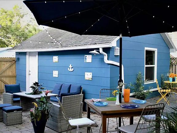 Walk to restaurants, shopping, downtown, Crescent Lake Park and the best beaches are 15-20 mins away. Hot Tub, outdoor solar shower. The open floorplan flows seamlessly. Guests can enjoy time together, with plenty of space to spread out. The updated kitchen has granite countertops, stainless steel appliances, and all the cooking accouterments allow guests to prepare even a complete holiday meal. A dining table for four, and a breakfast bar for two - everyone has a place to eat. Traveling with little ones? No worries - a high chair and pack-n-play crib are included in the list of handy amenities. Each bedroom is equipped with memory foam mattress, high quality pillows and high end silky bamboo sheets for that good nice sleep you're looking for. All 4 bedroom lamps have USB ports with easy access to charge your devices without having them far away from you. The bathroom with its granite counters and high-end fixtures starts your mornings with a bit of luxury. in the An extendable lighted magnifying mirror makes applying makeup or shaving an easier task. A built in custom Bluetooth speaker to listen to your favorite song while you relax in the large glass-enclosed shower. You will find this large shower has custom blue glass and marble tile with hints of gold features. There is plenty of room for one (or more). A built-in ledge holds shampoo, conditioner, and shower gel. Start your morning with coffee in the cozy sunroom. Pour some wine and indulge in a book or a game, surrounded by picture windows. Set up your laptop at the desk - a french door leading to the living room may be closed to help with focus. Large outdoor paved courtyard surrounded by a tall wooden fence. A versatile cushioned dining area offers seating for 7, perfect for snacking, visiting, and playing outdoor games surrounded by tropical plants and flowers. An outdoor pub table is nearby, with a solar light umbrella and seating for 4. Rinse yourself off after the beach with a newly installed outdoor shower. Soak as long as you want in the 5 person hot tub. Relax and enjoy yourself with the outdoor ambiance after a long day of enjoyment. Have some coffee in the front courtyard where you will find a sunny yellow bistro table for 2, privately surrounded by a white picketed fence. Enjoy the view of the Fox Palm Tree and the Hawaiian Plumeria Tree. An indoor/outdoor floor fan is available to keep things breezy and cool. Evenings are made even more charming by the string lights providing a celebratory ambiance. Put your grill master skills to work: A propane grill is ready to cook up some steaks or your catch of the day. This is a vacation rental fully furnished, a full clean in between the stay would be needed. 2 Bedrooms, 1 Bathroom, Florida room and amazing private courtyard with Hot tub, toiletries, with all additional amenities needed. This home is a few blocks away Crescent Lake and less than a mile to the St. Pete's Pier.