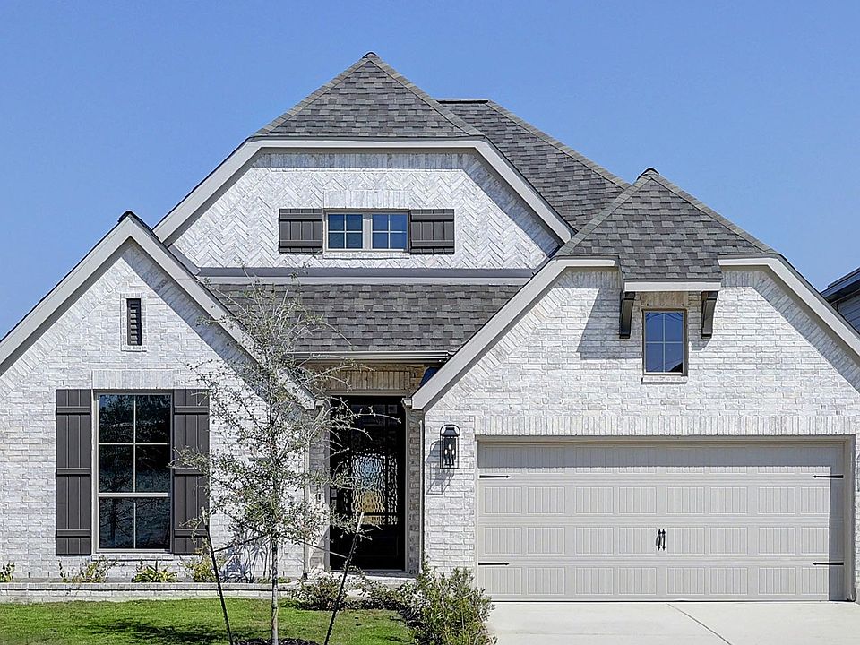 Entry with 13-foot ceilings framed by game room with French doors. Extended entry flows to the kitchen and dining area. Island kitchen with built-in seating space, 5-burner gas cooktop and a corner walk-in pantry. Family room with a wall of windows. Secluded primary suite. Primary bath offers dual vanities, garden tub, separate glass enclosed shower and two walk-in closets. Guest suite with a full bathroom and a walk-in closet. Secondary bedrooms and a utility room complete this one-story design. Covered backyard patio. Mud room just off the three-car garage.