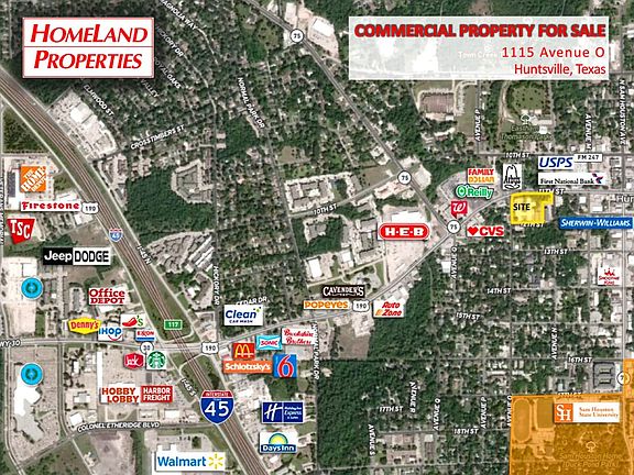 Exceptional Development Opportunity in the Heart of Huntsville This premier development site is one of the last of its size found in the center of Huntsville, offering unparalleled visibility on US 190/11th Street (19,436 AADT), with over 500 feet of prime frontage. The property spans four streets—11th Street, Avenue O, 12th Street, and Avenue N—providing superior accessibility and development possibilities. Currently zoned for mixed-use, the site accommodates a variety of commercial and residential applications. Utilities, including electricity, water, and sewer, are available on-site, with 12†water lines and 15†sewer lines found in proximity. The seller is willing to consider the removal of the existing structures and possible division of the property to meet the buyer's needs. A survey and detailed site plan, including utility locations, are available for review. Strategically positioned near major traffic generators such as H-E-B, Downtown Huntsville, Sam Houston State University, and Interstate 45, this property is ideally situated for a wide range of development opportunities. Do not miss this opportunity. Contact us today! MARKET HIGHLIGHTS: Huntsville, Texas offers an excellent quality of life and is home to Sam Houston State University (one of the fastest-growing universities in the state). It also has other major employers such as TDCJ, Region 6 Educational Service Center, Walmart, Weatherford, and many others, making it an increasingly valuable investment market. Sam Houston State University has a growing population of 21,000+ students which continues to increase the demand for economic growth in this area. DEMOGRAPHICS: 1 Mile 3 Mile 5 Mile Total Population 2024 11,795 40,500 50,718 Total Daytime Population 15,872 40,328 48,517 Average HH Income $47,489 $53,308 $65,250 *Demographic data derived from ESRI 2024