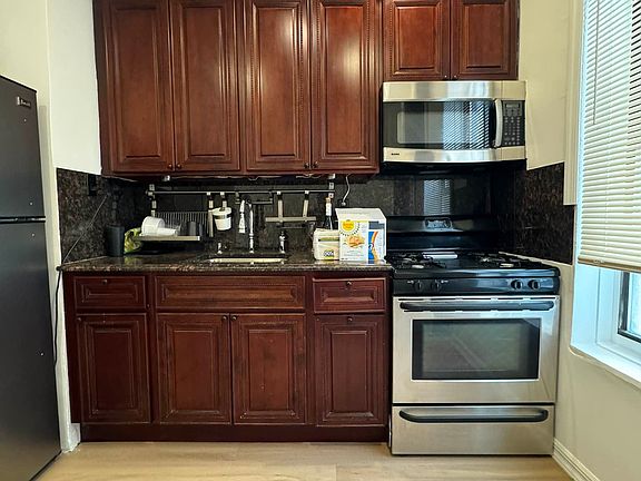 The apartment features a fully upgraded windowed kitchen with custom-made cherry wood soft-close cabinets and drawers with built-in under cabinet lighting, granite counter-tops, stainless steel appliances, a microwave, and a wine rack.