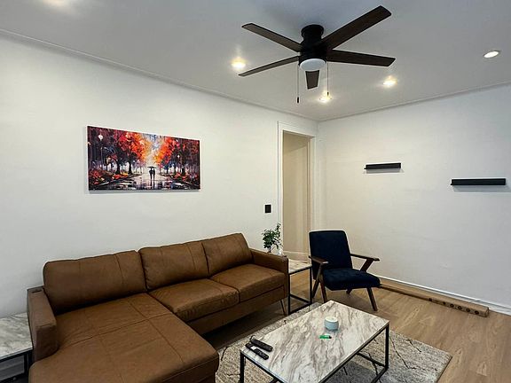 The living room features recessed and dim lighting, a large window facing towards the east, and a ceiling fan. The livingroom furnishings include a TV complete with stand, sectional couch, two coffee tables, and a chair for relaxing while you watch TV, read your favorite book, or entertain friends.