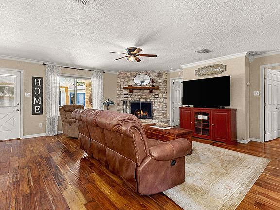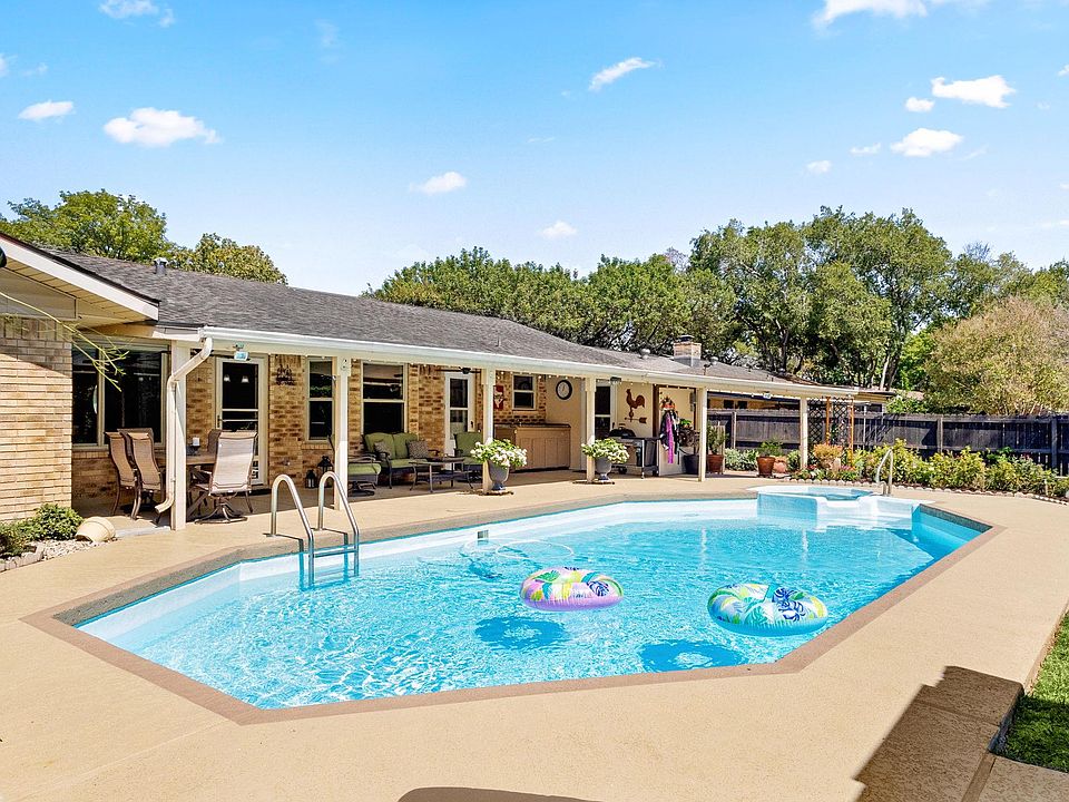 Welcome to your slice of happiness in New Braunfels! This beautifully updated 1-story home offers an open-concept design that blends comfort, character, & quality in every detail. Introduced by the lush St. Augustine lawn & thriving front yard landscaping, the porch's classic rocking chairs, custom cedar shutters & planter box showcases the owner’s undeniable green thumb, setting the tone for this beautifully maintained property—pure charm from the curb to the backyard fence! Step inside to wood & tile floors, & abundant natural light from double-hung vinyl windows paired with cordless honeycomb blinds. Sit on the hearth of the cozy wood-burning, limestone fireplace—perfect for warming up or entertaining. The open kitchen shines with high quality features: slow-close cabinets, deep drawers, 2 lazy Susans, 3 pantries (1 with its own coffee station & wine fridge), & butcher block bar. It flows seamlessly into a dedicated dining area bordered by a built-in cabinet with display glass, ideal for showing off your favorite pieces while taking in the lovely backyard views. Function meets flair in the dual utility areas—one for laundry & extra appliances, the other with a folding station, sink, & abundant cabinetry with direct access to the back yard, doggie door included! Outdoors, the good life continues with a sparkling pool/spa combo surrounded by Kool Deck surfaces. Let’s not forget the firepit zone—ideal for gathering under the stars & making those infamous s’mores. A detached, finished-out flex shed (complete with 2 separate entrances, A/C, & ceiling fans) adds the ultimate flex space for hobbies, exercise, play, or retreat. The spacious primary suite peeks into the backyard oasis, offering a peaceful retreat with a beautiful view. With a new roof (Oct 2025), 2024 HVAC, exceptional storage, & phenomenal proximity to all things New Braunfels, this home IS comfort, convenience, quality & pure joy. Come be awe-inspired & fall in love. This home is ready to be yours!