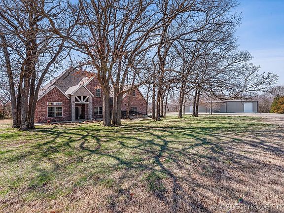 Due to no fault of the sellers, this beautiful home is back on the market! You still have a chance for this lovely home and stunning shop that are only minutes from Bartlesville. This 4 bedroom, 3 bath home on 5.24 acres, situated at the top of the property and beautifully terraced down the back hill to Butler Creek, offers spectacular views and abundant wildlife. The large master suite has French doors overlooking the covered patio and gorgeous views. Guest bedroom and bath downstairs with two additional bedrooms and third full bath upstairs. Great room with vaulted ceiling and wood burning fireplace with insert open to an eat-in kitchen with custom cabinets and granite counters. Large windows provide ample natural light and view of the covered patio and Butler Creek below. Second living area or office off of stately entry. Bonus room upstairs can be a game room, play room or additional video room. Home includes oversized two car garage, large floored attic with easy access from upstairs hall and phenomenal Koi pond (can be filled in). The property includes a modern 50’ x 100’ metal building constructed of 26 gauge steel with 13 foot sidewalls rising to a 16 foot center. Built in 2012 it was constructed on a 6 inch concrete slab over sand base with both rebar and wire mesh reinforcing in the slab. It was from Lucas Metal Works in Ochelata, Oklahoma. There is a 10 wide by 12 foot tall overhead door with opener and an 8 by 9 overhead door as well as pedestrian doors. The building includes a bath with oversized shower, a kitchenette area and an office and the building is heated, cooled and has internet capabilities. This is a first-class facility with a multitude of potential uses. A slice of paradise only minutes from Bartlesville.