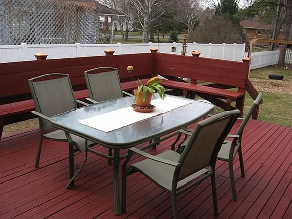 Classic & contemporary well-maintained 3 bdr home w/spacious,fenced-in back yard close to walking trail. Crisp & clean renovated kitchen opens up to dining Rm highlighted by a vaulted ceiling, sitting area, fireplace,bay window & patio doors leading to deck.Hardwood floors under carpet in bedrooms & hall. Full bsmt offers storage,workshop,laundry,bathroom & large finished family room boasting a custom Leinie's bar. Winter view of lake,nice landscaping,parking pad next to grg,grass alley in back.