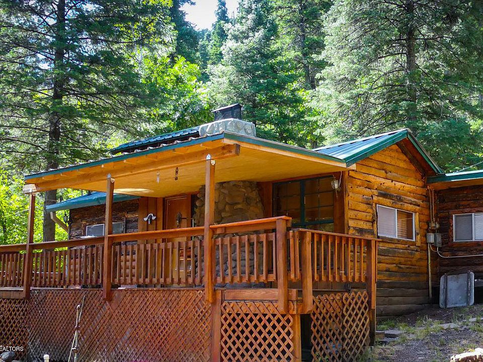 Classic log-sided cabin in the pine trees, with a breezy front porch & the ever-present sound of the river! Located on a spacious corner lot in historic Upper Canyon, this is perfect for a couple or small family. Both bedrooms are large and roomy. Living room and open kitchen area have high ceilings, which is rare for an older cabin. Half-circle driveway, fenced-in dog run, workshop, and mature fruit trees are just some of the bonus features. A little TLC would go a long way, here, with the option to add on or extend the deck. Comes furnished. Gaze up at the towering pine trees, sit back on the porch, watch the wildlife stroll by, and get ready to enjoy this quaint Ruidoso cabin.