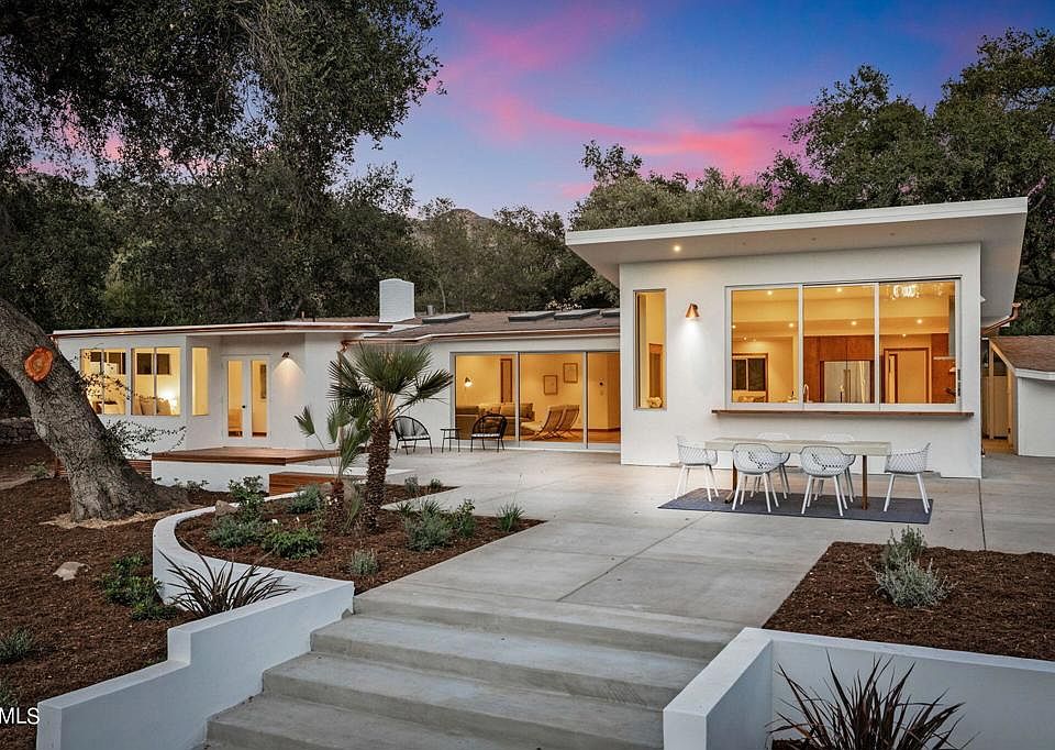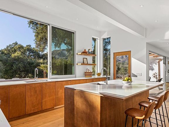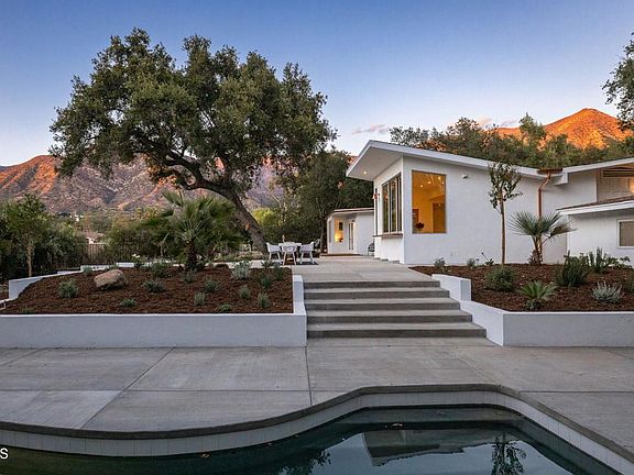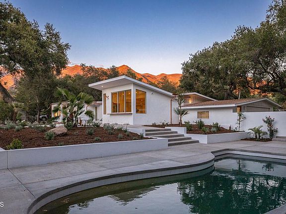 The perfect Ojai retreat! This mid- century estate has been lovingly restored and updated with great attention to detail. The property is set on approximately an acre located in the East End of Ojai on McNell Rd, which is shaded by a stunning canopy of Oak trees. There are gorgeous wood floors and cabinetry throughout the home along with a modernized fireplace in the living room and skylights. They also took advantage of the incredible views out to the property by creating more window space, raising the kitchen ceiling allowing for an abundance of natural light. There is a large kitchen with modern appliances, a pass-through window to the terrace, and a breakfast counter that opens up onto an outside patio area bringing the outside in! The guest bathroom is situated by a generous laundry area, with an ensuite in the primary bedroom and an additional bathroom outside the other two bedrooms. The pool area is an added bonus to this little paradise. Enjoy the private outdoors with views to the mountains, ample patio entertaining space and a charming rock wall entranceway that adds to the authentic East End vibe. This is a rare opportunity for new owners to create lasting memories together.