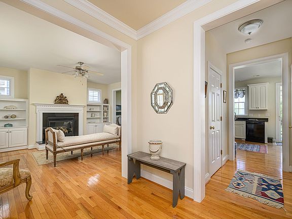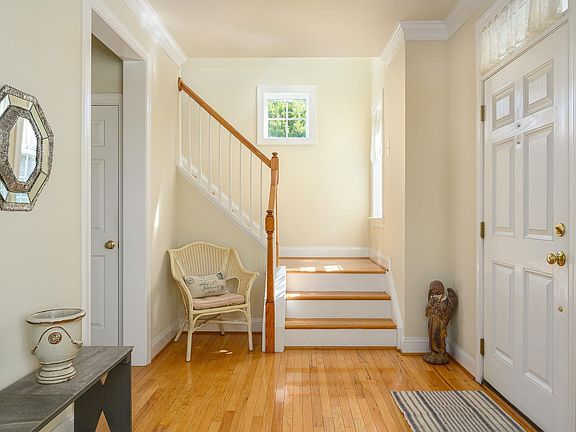 Nestled in a peaceful cul de sac just moments from historic downtown, this delightful home is full of character. Large windows flood the interior with natural light, creating a warm and inviting atmosphere. The layout flows seamlessly from one room to the next, with the living room featuring a cozy fireplace framed by built-in bookshelves. Adjacent to the living room are a formal dining room and a spacious eat-in kitchen. Upstairs, the primary suite is accompanied by two additional bedrooms and a bathroom. The full, unfinished terrace level offers walkout access. Enjoy the tranquility of a private deck with a pergola, overlooking a serene stream and lush greenery. Trane HTPUMP replaced August 2022.