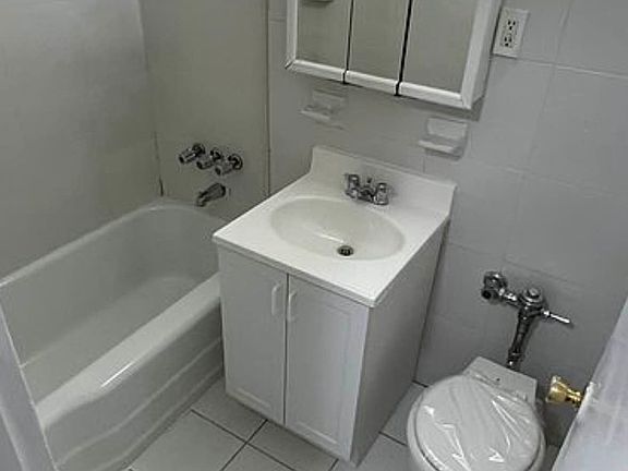 Bathroom with tub/shower, full tile, vanity & medicine cabinet
