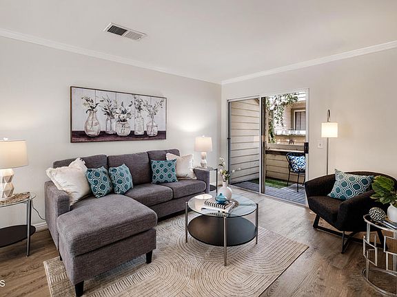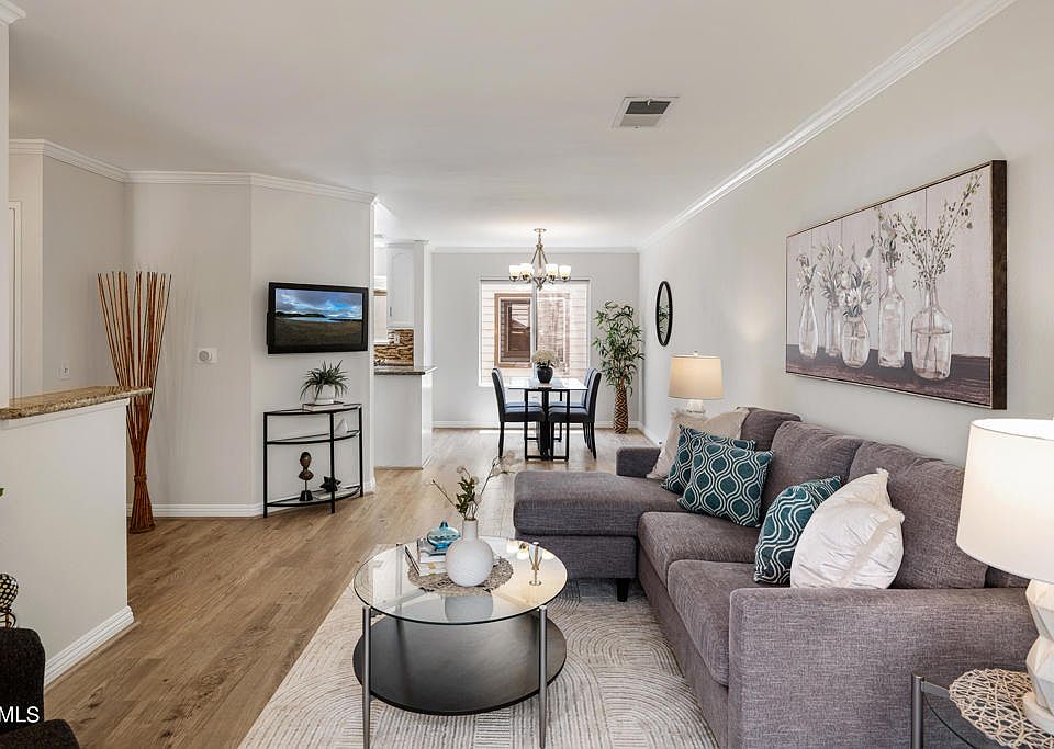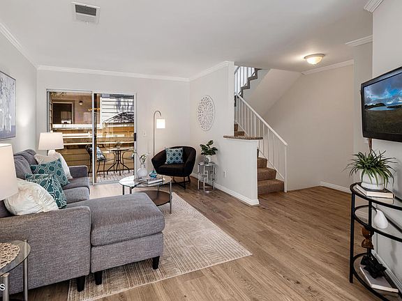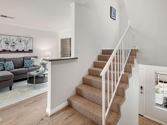 Welcome to your perfect new home! This delightful 2-bedroom, 2-bathroom townhome offers modern amenities and comfortable living in a secure, gated community. As you enter, you're greeted by elegant wood-like laminate flooring that guides you upstairs to the spacious and open living level. The living room, dining area, and kitchen blend seamlessly, creating an inviting space for relaxation and entertainment. The kitchen boasts beautiful stone countertops, a kitchen island, crown molding, recessed lighting, and a custom tiled backsplash. You'll love the top-of-the-line stainless steel Samsung appliances, including a 5-burner gas range, refrigerator, microwave, and dishwasher. A sliding glass door off the living area opens to a charming balcony, perfect for enjoying your morning coffee or evening breeze. Head up the next set of carpeted stairs to the bedroom level. The first bedroom to the right is generously sized, featuring dual-pane windows and a spacious closet. Between the two bedrooms, you'll find a full bathroom with tile flooring, a single sink vanity, and a tub and shower combination. The carpeted primary suite is a serene retreat with vaulted ceilings and a walk-in closet. The attached bathroom offers tile floors, a single sink vanity, and another tub and shower combination, providing a spa-like experience right at home. This townhome also includes a convenient 2-car garage, providing ample storage and side-by-side washer and dryer. The gated community offers peace of mind with round-the-clock security and features three swimming pools and spa areas. Enjoy access to community barbecues and two playgrounds, perfect for family gatherings and outdoor fun. Don't miss this opportunity to live in a vibrant community with top-notch amenities and a beautifully designed townhome. Make this your new home today!