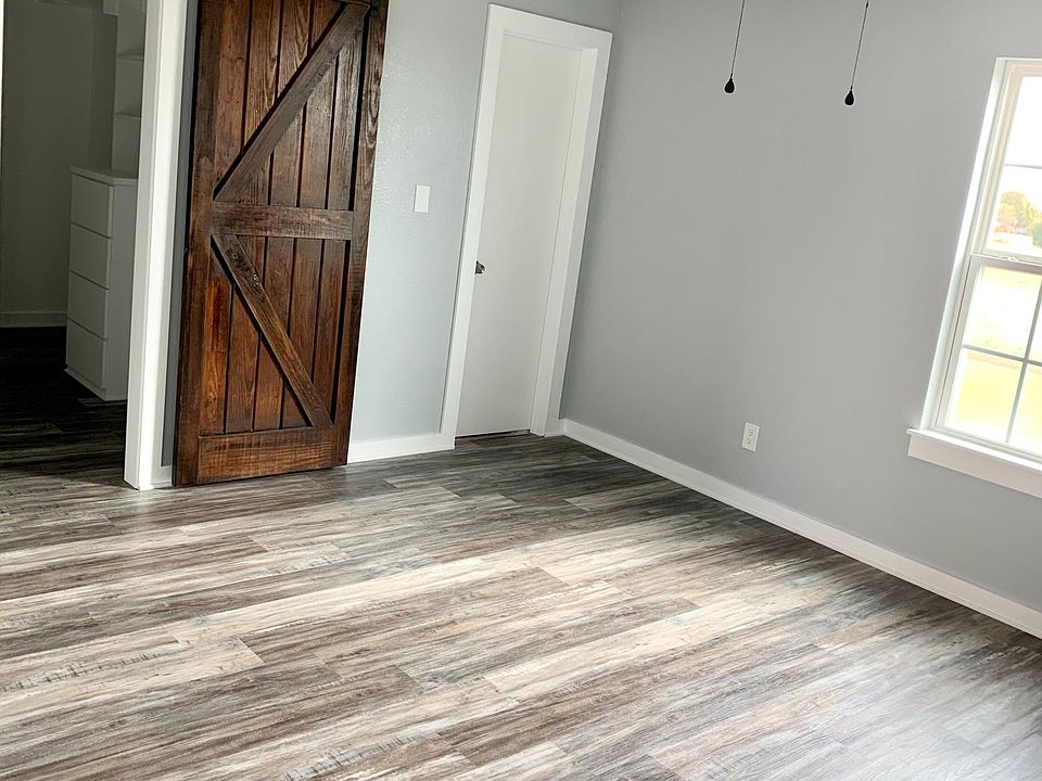 Master bedroom with a separate walk in closet and laundry space for washer and dryer with a big barn door, master bathroom has a lovely vanity, and beautiful shower. Kitchen and dining area with stainless steel appliances. Vinyl waterproof flooring throughout the house.