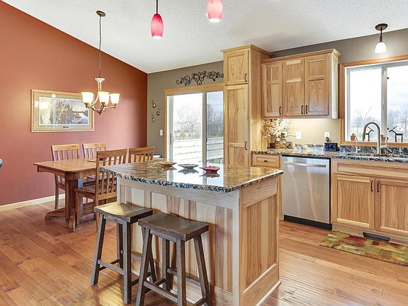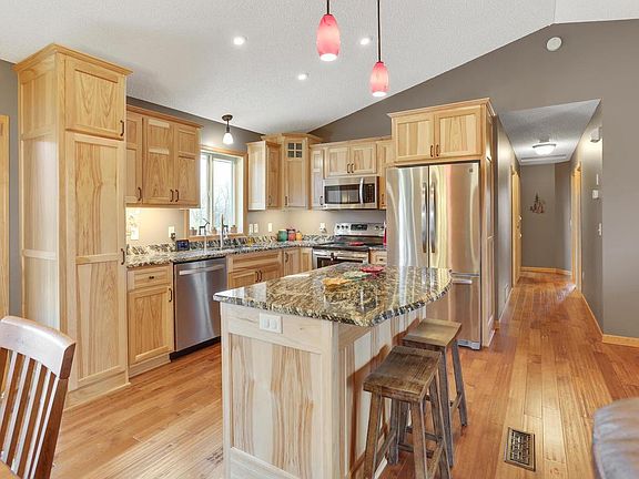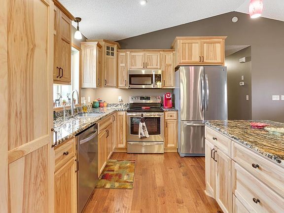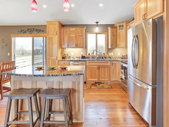 Stunning 4BR, 2BA home on 5 acres! Gorgeous kitchen features custom hickory cabinets, granite, center island, SS appliances, wood floors. Open kitchen, dining, living room layout. Vaulted ceiling. Finished lower level has huge family room and gas fireplace. Laundry room. New carpet on main level. New tiled floors in foyer & bathrooms. Huge yard filled with variety of trees, providing added privacy. Large deck and patio/firepit, great for entertaining!
