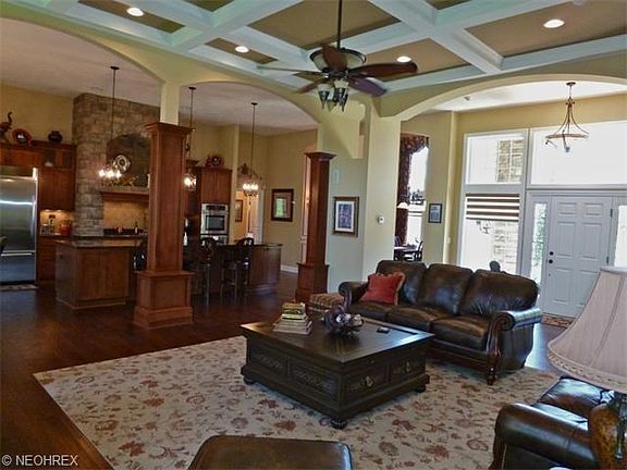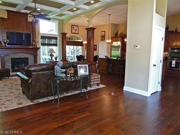 Impressive and beautifully appointed this Cambden Creek Ranch welcomes you from the minute you drive down the cul-de-sac. Professionally landscaped this stone front home has so much attention to detail. Open floor plan with gleaming hardwood flooring, 12â ceilings through-out ,quality wood work and molding, expansive granite island w/seating, pantry, built-in appliances in eat-in kitchen, stone archway graces the cooking area, gas fireplace in great room plus wood columns, 16â ceiling in formal dining w/wall of windows, master suite with 13â walk-in closet, sitting area, ceramic bath w/ jetted tub & double sinks, split design floor plan with second bedroom and also a third bedroom w/bay window is the current Library with bookcases for thousands of novels, first floor laundry room, custom window treatments, delightful decor & tasteful lighting fixtures, Entertaining size Walk-out lower level with powder room, game room, storage room and family room offering fireplace & French doors to back lot, Phantom screened Sun Room with views of the pond, fountain, flowering trees and brick patio, gas line for grill, tiered gardens manicured to perfection, 3 car garage with cabinetry, sprinkler & security system,12 month home warranty. Truly a spectacular 6 yr. old home for easy living and entertaining. You will feel as if you just walked into a model with superior detail and high end, custom features.