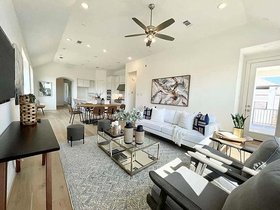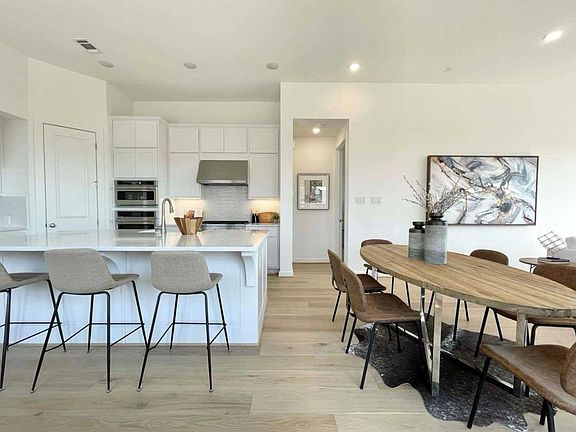 Modern 3 bedroom, 2 bath home built in 2022 by Highland Homes in highly sought after, award winning, Wolf Ranch community in Georgetown, TX. Unique side entrance welcomes you to the house which features a white painted brick exterior, chateau roof and ebony trim accents. Step inside to an open concept with 11 ft ceilings, 8 ft doors, and beautiful hardwood floors throughout. The kitchen stands out with high end Energy Star Certified GE stainless steel appliances, 36" 5 burner gas cooktop, built in ovens, stainless steel range hood, refrigerator, white cabinets, wood flooring, quartz counters, recessed lighting, and Blanco apron sink on the kitchen island. Primary suite offers serene hilltop views overlooking homes below, dual bathroom vanity, large walk in closet, and a tiled to the ceiling walk in shower and standalone tub. Covered patio overlooks the neighborhood. Additional features include 2" faux wood blinds, central vacuum system, tankless water heater, and smart home features. Prime location in Wolf Ranch neighborhood with easy access to the River Camp community center featuring the resort style community pool, fitness center, sport courts, and access to scenic nature trails. Enjoy the easy access to charming Georgetown Square and Wolf Ranch's own dining, shopping, events, and elementary school. Lawn service is included for low maintenance living!