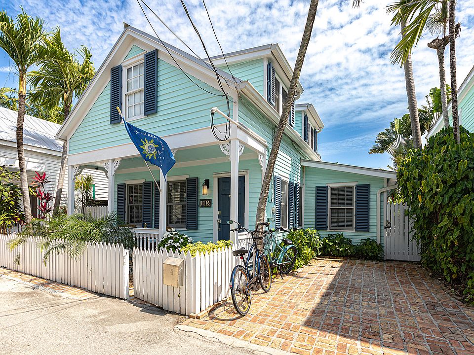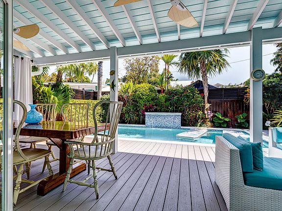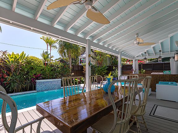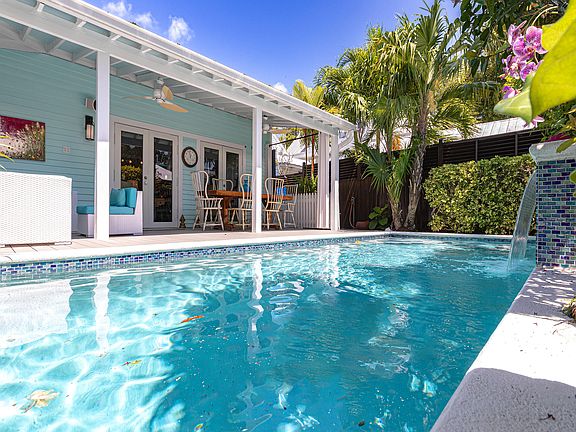 This quintessential two story, 3/2 Key West home is situated in the Historic Seaport District on a quiet lane with coveted off street parking.....The original structure can be traced back to the 1850s and has many beautiful historic features such as Dade County Pine walls and flooring. The home has a wonderful open design with the kitchen overlooking the large, vaulted living/dining area. A wall of French doors welcomes you on to the spacious, newly renovated composite deck and covered porch overlooking the pool area. The sparkling 23ft heated, saltwater pool has a waterfall feature plus swim jets and is surrounded by a luxuriant yard full of beautiful trees and shrubs. For added convenience there is a wet bar and outdoor shower.....The kitchen has many desirable features including stainless appliances, granite counters and a wine cooler.....On the main level there is a good sized bedroom steeped in rich Dade County Pine accents and a full bathroom with a deep soaking tub and gorgeous Brazilian slate flooring as well as ample storage. There is also a spacious office/den area which can easily be used an an additional sleeping quarters if need be,....The whole of the upstairs is dedicated to the main suite with a beautiful full bathroom that has Brazilian slate on the floors and in the shower. There are also two large closets with plenty of room for storage.....Recent additions include new AC systems and a new ''on demand'' water heater. For peace of mind there are storm shutters for all windows and doors.