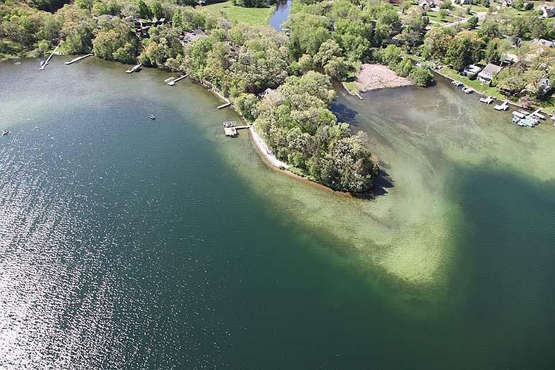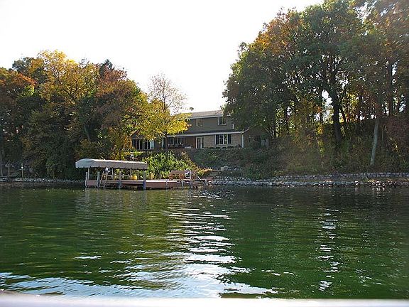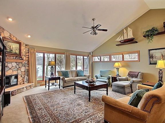 Situated on your own private peninsula, this property has 800 ft. frontage, 1.3 acres, and a beautifully updated home. Lake views from every room! Enjoy the crystal clear frontage with a firm pebble bottom. The comfortable great room has a vaulted ceiling, GFP w/fieldstone surround and kitchen features a stunning stainless steel 6-burner range, uba tuba granite counters, tile backsplash, & walk-in pantry. Stunning Master Suite w/massive walk-in closet, HWFs, & gorgeous private bath!