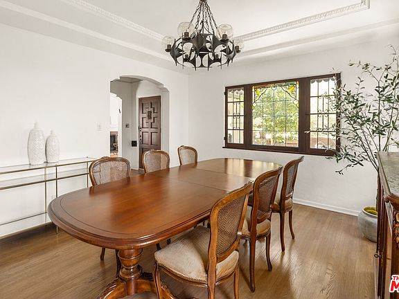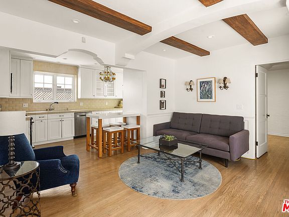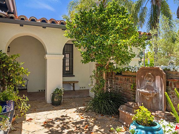 This enchanting 1930s Spanish home blends timeless architecture with thoughtful updates, offering both warmth and functionality. A brick-paved walkway and trickling fountain lead you to the formal entry, setting the tone for what's inside. The 1,886 sq ft main house features three bedrooms and two bathrooms. A generous living room welcomes you with a wood-burning fireplace, original painted beams, and a west-facing stained glass window that fills the space with natural light and vibrant color. Refinished hardwood floors flow throughout, connecting the formal dining room to the kitchen and family room. The kitchen is fitted with GE, Frigidaire, and Bosch appliances, topped with Ann Sacks tile that brings warmth and texture to your meal prep space. At the heart of the home, a private central courtyard invites you to linger outdoors. Anchored by a brick oven that doubles as a fireplace, it's perfect for al fresco dining, whether you're sharing wood-fired pizzas, slow-roasted meals, or simply gathering around its glow with friends. French doors in the spacious primary suite open to a lush backyard oasis framed by olive, lime, and kumquat trees, offering plenty of room for both entertaining and quiet retreat. The property also includes a detached 600 sq ft (approx.) guest house with one bedroom, one bathroom, and an open living/dining/kitchen layout. Delivered fully furnished, it's ideal for a home office, studio, or visiting friends and family. Set in a central pocket of Los Angeles, this home puts you close to everything. Enjoy quick access to Beverly Hills, The Grove, LACMA, and the Farmers Market. Whether you're headed to downtown, Century City, or the beach, you're about 15 minutes away in any direction with easy freeway access. Tree-lined streets and nearby cafes add to the everyday charm, while cultural destinations and shopping are right around the corner. Come tour this gorgeous home in person!