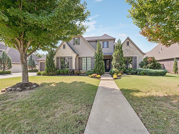 Stunning luxury home in the highly sought-after Jenks School District offering over 5100 (AP) sq ft of beautifully designed living space. This gorgeous home features 4 bedrooms, 3 full and 2 half baths along with two separate 2-car garages for a total of 4-car parking. The expansive primary suite offers wood floors, vaulted & beamed ceiling and a spa-like bathroom with dual vanities, dual closets, an oversized frameless shower with multiple shower heads including a rainfall feature, and a separate jacuzzi tub for a serene retreat feel. The large guest suite is also located downstairs, perfect for in-laws or long-term visitors with privacy & separate "secret" garage entrance. The open-concept family room features a striking stone fireplace flanked by custom built-ins and flows seamlessly into the gourmet kitchen and spacious breakfast nook. Formal dining and a private office add to the home's versatility. Elegant hardwood floors, coffered ceilings, and extensive trim highlight the craftsmanship throughout. A large 2 story entry leads to an extra wide staircase where upstairs you'll find a large gameroom with closets leading to a separate homework/office/hobby hub, plus two oversized bedrooms with a walkthru pullman bath, an additional half bath and an oversized theater room with large wet bar, microwave, and refrigerator. The backyard is designed for entertaining with a covered patio, extended pergola, outdoor fireplace, inground gunite pool plus waterfall spa, all surrounded by mature trees for privacy. Additional features include full foam insulation, a whole-home generator, water filtration system, tornado safe room, 4 HVAC units and a backyard dog run area. Exceptional design, abundant amenities, and an incredible location make this home a rare find.