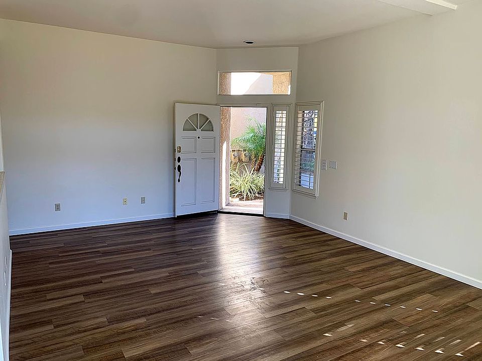 Bottom floor unit, brand new flooring and walk in shower. New stove in kitchen. Vaulted ceilings, gas fireplace, patio area, quiet neighborhood. Access to shared pool and jacuzzi (not available at the moment due to COVID). Non smoking unit, tenant pays all utilities, landlord pays for ADT Alarm/water/garbage. 2 parking spaces, one inside garage and 2nd is a carport. Must qualify and pass credit check.