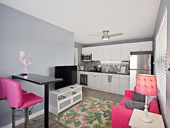 Super cute Flamingo themed furnished apartment just 2 blocks from the Gulf beach sands, away from the traffic noise of Gulf Blvd, this super clean and renovated with everything you'd expect in a 1BR apartment. Close to John's Pass, restaurants, shopping, Publix and more. No elevator at property, apartment is one flight of stairs up.