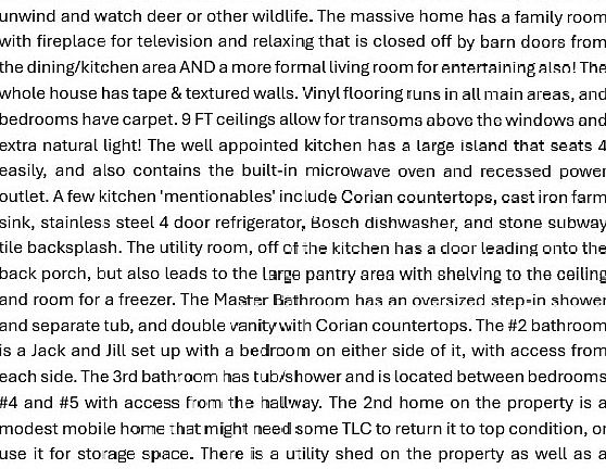 Look no more! This 5 BDRM/ 3 BA home 2136sf on 10 acres also has an additional, smaller home on the property! Nestled amongst native hardwoods & pines along a county maintained limerock road, this private 10 acre tract has a cleared area around the large home & an area toward the back of the property & along the front & sides that is wooded & gives great privacy. The 2020 built home has a covered porch on the back that offers a great way to unwind & watch deer or other wildlife. The massive home has a family room with fireplace for television and relaxing that is closed off by barn doors from the dining/kitchen area AND a more formal living room for entertaining also! The whole house has tape & textured walls. Vinyl flooring runs in all main areas, and bedrooms have carpet. 9 FT ceilings allow for transoms above the windows and extra natural light! The well appointed kitchen has a large island that seats 4 easily, and also contains the built-in microwave oven and recessed power outlet. A few kitchen 'mentionables' include Corian countertops, cast iron farm sink, stainless steel 4 door refrigerator, Bosch dishwasher, and stone subway tile backsplash. The utility room, off of the kitchen has a door leading onto the back porch, but also leads to the large pantry area with shelving to the ceiling and room for a freezer. The Master Bathroom has an oversized step-in shower and separate tub, and double vanity with Corian countertops. See photos for full property description!
