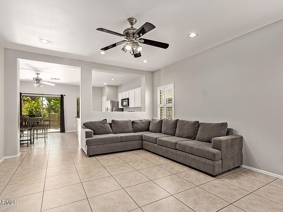 Attractive two-story KB Home built in 2005 offering charm, comfort, and convenience. This 3-bedroom, 2.5-bath home features a spacious 1694 sq ft open floor plan with tile flooring throughout. The kitchen showcases stainless steel appliances, white cabinetry, and matching countertops that brighten the space. Plantation shutters, a cozy covered patio shaded by citrus trees, and a 2-car garage with storage and generous slab parking add practicality and appeal. Enjoy a short 2-minute walk to the community pool, jetted spa, and lush greenbelt filled with mature elm trees. Prime location minutes from Gateway Pavilions, everyday shopping, restaurants, healthcare, schools, gyms, and easy freeway access via I-10 and Loop 101.