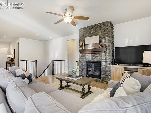 Timeless Design | Inspired Living — Nestled in The Farm, one of North Colorado Springs’ most sought-after master-planned communities, this thoughtfully designed ranch-style home captures the essence of modern Colorado living. Enjoy tranquil mountain views, an extensive trail system, scenic ponds, community parks, and open spaces just steps from your door. Expertly crafted by Vantage Homes in 2020, it blends clean architectural lines with warm, welcoming finishes and intentional spaces designed for connection, comfort, and effortless style. Rich oak hardwood floors flow throughout the open-concept main level, anchored by a stone-surround gas fireplace and abundant windows that fill the home with natural light. The gourmet kitchen is a true centerpiece, featuring a grand island with designer pendant lighting, quartz countertops, and sleek stainless-steel appliances—perfect for both quiet mornings and lively gatherings. The main-level laundry and mudroom combine function and design for everyday ease. The primary suite offers a tranquil retreat with gleaming hardwood floors, a spacious walk-in closet, and a spa-inspired ensuite with dual sinks, quartz countertop, and a frameless walk-in shower with bench seat. A main-level guest suite, two lower-level bedrooms, and space for a future fifth suite provide flexible living options. The finished basement impresses with 9-foot ceilings, a large recreation room, three-quarter bath, and generous storage pre-plumbed for a future junior suite. Outdoors, enjoy an expansive covered patio framed by professional landscaping and sweeping mountain views on a sprawling 0.23 Are Lot—an ideal setting for al fresco dining, morning coffee, or starlit evenings. Life at The Farm centers around connection, with access to The Gathering Place clubhouse, pool, fitness center, trails, and year-round community events. Where modern convenience meets natural serenity, this is Colorado living at its most inspired.