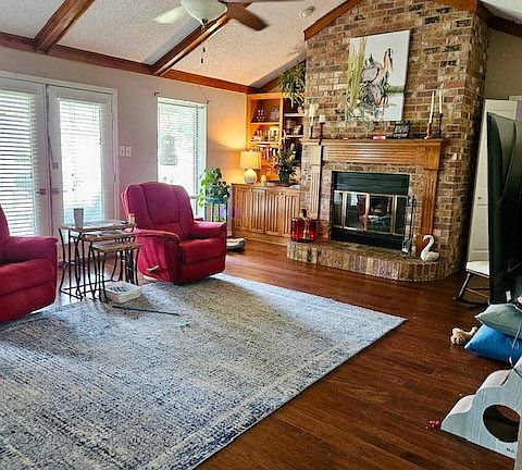 Wood burning brick fireplaceSeparate dining roomGorgeous quartz countertopsVaulted ceilingsPrimary suiteBeautiful wood cabinetsBay window