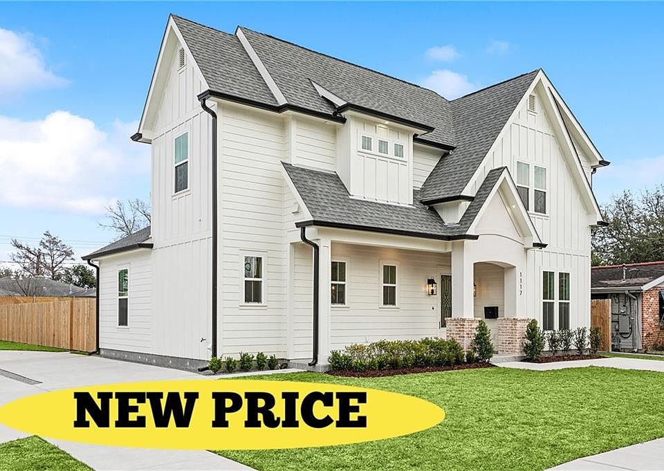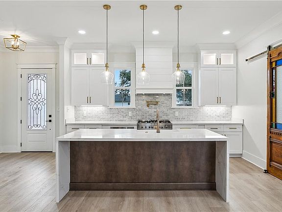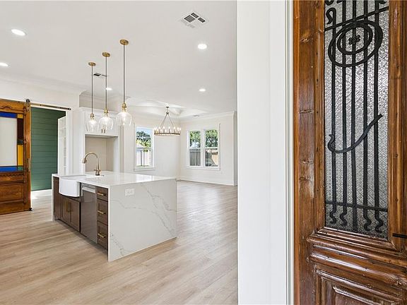 NEW 5 BD 4 BA modern farmhouse sit on a CORNER lot with SLATE porch, 22” COPPER GAS lantern & OLD CHICAGO brick columns. Step into this CUSTOM built home designed w/GOLD finishes, NATURAL wood tones & reclaimed ANTIQUE doors that showcase rare woodwork with Art deco mosaic & stained glass. Captivating kitchen w/CALACATTA GOLD QUARTZ, honed marble backsplash, 36” VERONA gas stove, custom hood, pot filler, BOSCH dishwasher & SHARP microwave drawer. A stunning 42” DOUBLE WATERFALL island with farmhouse sink, bell glass shaped pendants & seating. One of a kind dining has 11 ft CRISSCROSS COFFERED ceilings, French Oak & Champagne gold farmhouse CHANDELIER & WET BAR featuring a wine rack & built-in wine display niche. Enjoy entertaining in the OPEN LIVING room which features a beautiful FIREPLACE with Cypress mantle surrounded in shiplap & Quartz. Exquisite 1st floor PRIMARY SUITE offers a walk-in closet, 2 independent white quartz vanities & matte black finishes. Relax under your CRYSTAL CHANDELIER in your 71” SOAKER tub w/built-in wall niche & handheld shower, or enjoy the RAINFALL SHOWER system w/a frameless CORNER glass enclosure. Includes 1st floor guest bedroom/office + full bath designed w/EGYPTIAN reclaimed door, marble farmhouse vanity, lattice mosaic flooring & walk-in shower. UNIQUE HIDDEN pantry & laundry area behind the sliding antique door opens to an Enchanted Forest green shiplap wall, crown molding & shelving. ALL 3 upstairs bedrooms include WALK-IN CLOSETS, 2 of which feature DESK/NICHE AREAS & the 3rd has 11 ft ceilings w/a 60” ceiling fan. Host outdoor gatherings by adding a kitchen or indulge in quiet evenings under the COVERED PATIO & private backyard surrounded by a 6 ft tall cedar fence. ADDITIONAL FEATURES: Luxury vinyl wood flooring, White oak stairs, staircase chandelier, GUTTERS, tankless water heater, 2 Nest cameras, Ecobee thermostats, slab built on PILINGS, Showcase windows & 2 ATTICS! Plenty of parking w/front driveway & side circular drive