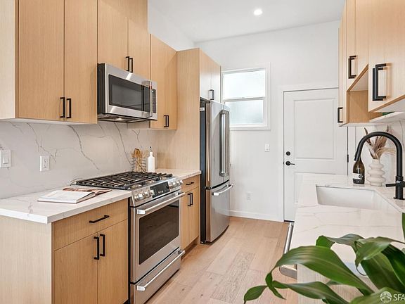 This 1BD/1.5BA residence blends natural light, modern design, and thoughtful finishes in a vibrant setting where Noe Valley meets the Mission. Light filters in through west-facing windows, highlighting an airy open layout and European white oak floors. The kitchen is designed for both style and function, with GE Caf appliances, including a 5-burner gas range, quartz countertops, Scandinavian-inspired cabinetry, and a farmhouse sink. The bedroom suite features a walk-in closet and a contemporary bath with a floating vanity, porcelain tile, and a shower-tub combo. A guest powder room mirrors the same finishes. A guest powder room mirrors the same finishes. Additional amenities include an in-unit GE washer/dryer, private storage, bike storage, a trash chute, and access to a shared yard. Recent building-wide upgrades include structural and seismic improvements, updated electrical systems with new wiring and subpanels, Cat 5 cabling, new tankless water heaters, a central fire alarm system, a video intercom with app-based entry, and refreshed landscaping. Located just one block from Valencia Street, enjoy easy access to public transit and the neighborhood's renowned food scene, nightlife, and culture, while also bordering the charm and calm of Noe Valley. 99 Wal