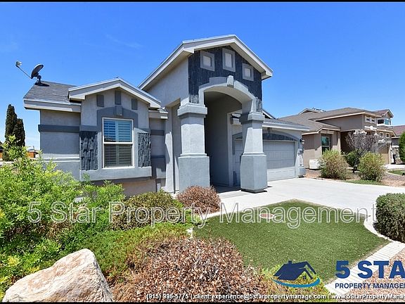 Just minutes from El Paso's top outdoor playgrounds and dining hotspots, this bright 3-bed, 2-bath home showcases clean lines and intentional textures throughout. Enter into a sunlit foyer that opens to sweeping tile floors and an open-plan kitchen. Granite counters wrap around a peninsula island, creating distinct prep and serving zones framed by a custom glass-and-stone backsplash. Above, wired lighting and a stainless range hood highlight the cook's domain. The primary suite features a dual-basin vanity and a spa-style bath with a freestanding garden tub and glass-enclosed shower. Two additional bedrooms enjoy plush carpeting and easy hallway access to a second full bath. A covered patio extends living outdoors, ideal for weekend barbecues. With John Drugan Elementary, Americas High School, parks, shopping, and hospitals all just a short drive awayand instantaneous access to Loop 375 and I-10this is homebase for every chapter of your life. Deposit-Free Renting service to Obligo qualified renters, fees may apply.