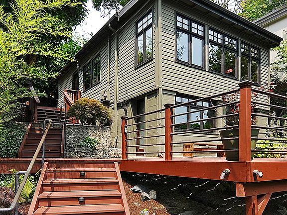 Available Now ~ Rare Madrona jewel box rental situated on quiet and green street. Main floor offers open living space with bright picture windows and updated fully equipped kitchen, plus a power room. Downstairs you will find a roomy and comfortable primary suite with attached bath and laundry room and walk in closet. Two walk out patios - one off of primary and one off of main floors. Upstairs attic with slanted roof great for storage or hobby room. Fantastic location blocks from Lake Washington and Madrona's shops & restaurants. You will love this community! Street parking only. Rent includes yard care services. Tenants responsible for all utilities. No smoking. 1 cat or 1 dog up to 15 lbs permitted.