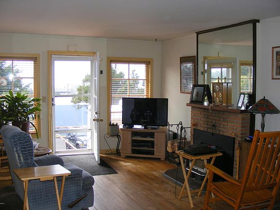 Peek of YaQuina Bay and ocean. Sit on rear deck or garage deck and enjoy the sunsets. Shop area, office area, w/s insert in living room fireplace. Fir floors. Located close to Newport's bayfront and short route to easy beach access.
