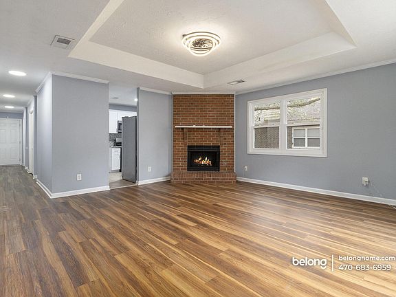 Warm wood-style flooring welcomes you into a bright and inviting living area centered around a brick fireplace, creating an atmosphere meant for quiet evenings or lively conversation with friends. Natural light stretches across the room, drawing you toward the dining area where you cn share unhurried meals and everyday rituals that make a space feel like home.