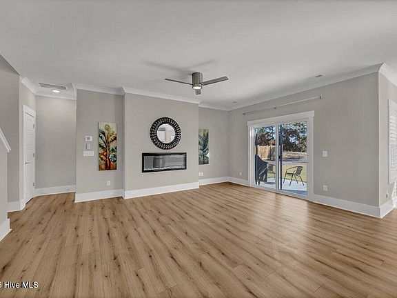 Almost new and ready for immediate delivery, this stunning Herrington Home sits on an elevated, oversized lot overlooking a tranquil wooded buffer. This sought-after floor plan features a spacious first-floor primary suite plus an additional bedroom on the main level, with two more bedrooms and a large flex room upstairs—ideal for guests, hobbies, or a second living area. The heart of the home is a beautifully designed open living space. The dream kitchen shines with a gas cooktop, abundant cabinetry, a generous center island, walk-in pantry, and a built-in desk perfect for a coffee station. A brand-new stainless refrigerator remains. The living room offers a warm, modern feel with its sleek linear electric fireplace. LVP flooring flows throughout all main living areas and the primary suite, complemented by gorgeous moldings and custom 3-inch plantation shutters throughout. The primary suite provides a luxurious retreat with split vanities, a large tiled shower, and an impressive walk-in closet. All three additional bedrooms also feature spacious walk-in closets. A nicely sized laundry room comes complete with a brand-new washer and dryer set. Upstairs, the oversized flex room offers endless possibilities—game room, home office, media room, or gym. Additional perks include a walk-in attic with floored storage, a two-car garage with a side-entry people door, and a rear patio with a direct gas line—perfect for effortless outdoor grilling. Located in the highly desirable Riverlights community, residents enjoy exceptional amenities including a clubhouse, fitness center, pool, walking trails around a serene lake, multiple parks, and playgrounds.