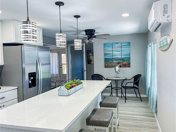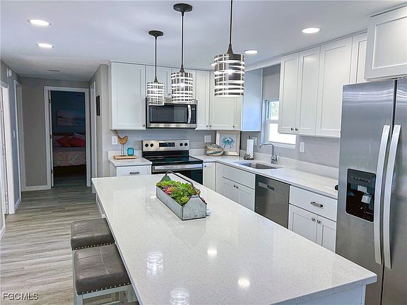 Your slice of tropical paradise is calling—more than just a home, it’s an invitation to embrace an active lifestyle where every day brings a new adventure! SELLER FINANCING OFFERED! This delightful beach cottage, featuring 3-bedrooms and 2-baths, is offered at a great value!Completely remodeled in 2023, it boasts modern upgrades including new cabinets, quartz countertops with an expansive eat-in kitchen island, stainless steel appliances, luxury vinyl flooring throughout, updated bathroom vanities, and tub/shower combinations. The home also features indoor laundry hook-up for added convenience. The open-concept eat-in kitchen flows into a spacious, sunlit family room, perfect for entertaining. Comfort is key with four raised mini-split units keeping the temperature just right. The thoughtful split-bedroom layout includes two guest bedrooms and a guest bath, along with a primary bedroom offering an en-suite bathroom. Relax and enjoy the coastal breezes from the lanai or front open patio, or make the most of the private backyard, which has great potential for creating your ideal outdoor retreat.Bayside Estates, is a highly desirable boating community, close to beaches, restaurants and more! 3 miles to Margaritaville Beach Resort, 8miles to Sanibel Island. Take the trolley down to the beach, restaurants, and other local attractions. Bayside Estates is a 55+, manufactured home community with so many activities to choose from. Approximate Lot size 51’Fx88’Rx88’Lx51’B via Lee County Appraiser. The communityClubhouse & Office now have a water barrier planking system up to 31” High & Cool Seal waterproof insulated paint. Buyers in Bayside pay a$2600 resale capital contribution fee.