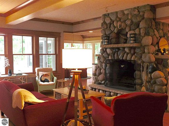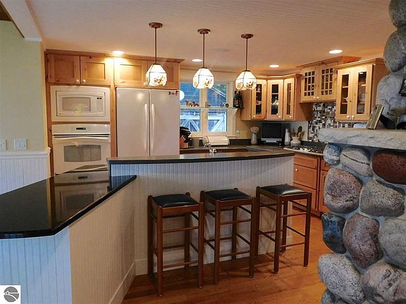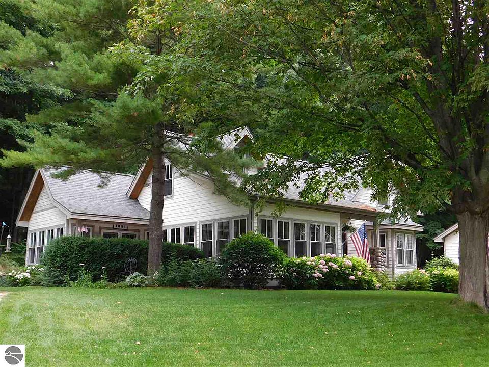 Charming Farmhouse overlooking the blue waters of East Bay on Old Mission Peninsula. Handcrafted Quality and attention to every detail in this home by Traverse City's established premier builder is one of a kind. Lake Superior Stone Fireplace, Original Wood Ceilings, Oak Floors, Custom Alder Wooden Hammer Cabinets, Heated Tile Floors and more! Unique Character extends outdoors with Oak Soffits, Stone Pillars and Stone Patios that take in the fabulous Water Views and Rockwall Gardens. 72 Feet of Private Water Frontage with Dock for your own boat slip. Take the iconic drive along Bluff Road to HOME...you won't regret it!
