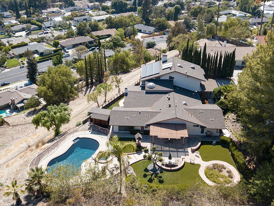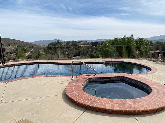 Enjoy the expansive views from this 5 bedroom home at the end of the cul-de-sac! The sweeping lot offers a pool with a large spa and multiple entertainment areas. The interior living area has been graciously extended and includes a wood beam volume ceiling and a fireplace Beautiful granite counters, updated appliances, a walk in pantry and breakfast area are in the kitchen. There is a brick lined fireplace in the large family room. A unique spiral stairway leads to the private upstairs master suite offering a balcony and multiple windows with great views! There is also a sitting area with a fireplace. A large steam shower, jetted soaking tub, heating lights and double sink vanity are in the lavish bathroom. The generous size walk in closet and an additional room/walk in closet, plus mirrored closet areas make for great storage. A bedroom suite with multiple closets and a slider door out to the covered patio is on the main level. Private bathroom includes a double sink vanity. 3 spacious bedrooms and a bath are nearby. Amenities include ceiling fans, skylights, security system and a solar system. Incredible views are enjoyed from the sweeping entertainment yard, multiple patios and large pool & spa. Award-winning Conejo Valley School District.