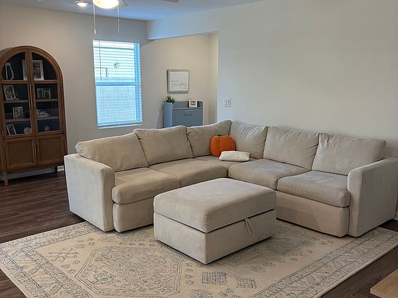 The home has low maintenance landscaping in the front yard, with a few desert plants and trees. The backyard is perfect for entertaining- a small porch, custom paver extension to the backyard and then lush grass and bushes for privacy.