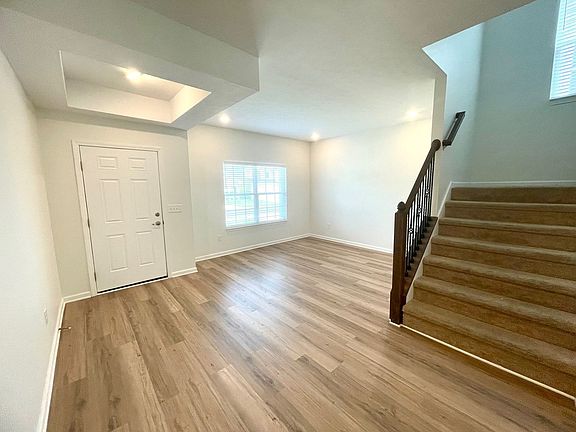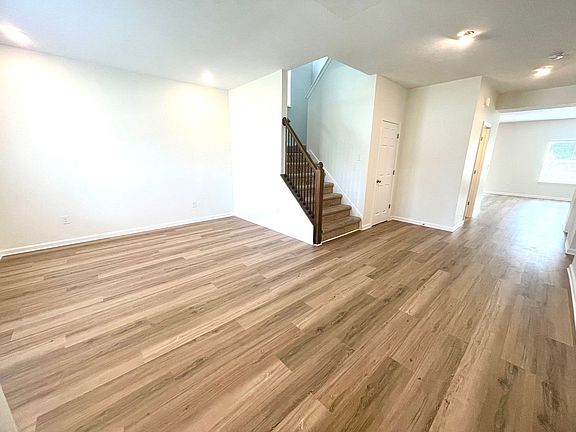 As you enter, you're greeted by an open foyer and formal dining room or "flex" space to your left. Down the foyer, you'll have a full ground-floor bath, utility closet, spacious bedroom, and access to the 2-car garage. In the rear of the home, you'll have the beautiful fully equipped kitchen that's open to the great room. The kitchen has ample cabinet and counter space with a large walk-in closet and sleek stainless steel appliances. Just off the kitchen is a patio that looks out to a wooded lot.