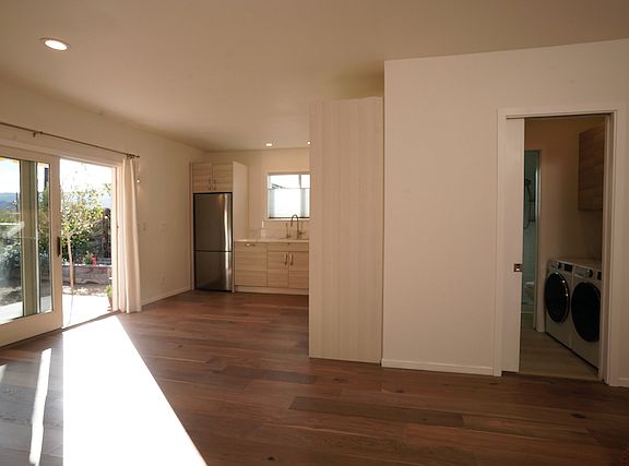All utilities and internet included in monthly rent! This brand new studio apartment is located in a quiet neighborhood near Topa Topa School, with a private entrance and private yard. It boarders an orange grove and has expansive views of the Topa Topa mountains. The modern unit features an open floor plan with ample natural light, modern smart LED lighting, hardwood flooring, a full kitchen with generous pantry and cabinets, full electric range, microwave and dishwasher, and a full size sink. The apartment has its own brand new front loading washer/dryer, and built in closet and cabinets with lots of storage. A beautiful Anderson sliding door connects you to a patio with a motorized retractable awning and a beautiful private garden with two raised garden beds. Ample insulation and a new mini split for heat and air will keep you comfortable in Ojai weather. All utilities included. one person occupancy, no pets, no smoking, no loud parties