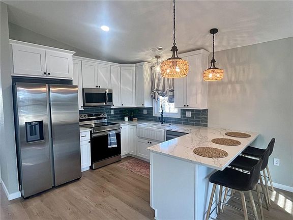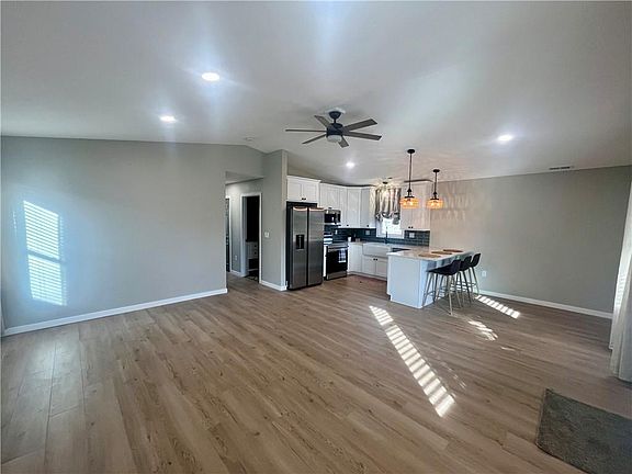 Who's in the market for a NEW home this NEW year? This 3 bedroom/2 bath is well built, stylishly designed and move in ready! Large open living room with vaulted ceilings open to the kitchen with soft close cabinetry, plenty of storage, quartz countertops, brand new appliances and an oversized peninsula with seating. Large front porch, with a swing, is perfect for watching sunsets. Bedrooms all include ceiling fans, blinds and spacious closets. Primary bedroom includes a feature wall, sconce lighting and a barn door to the private bath. Out the back door is a large patio area and new wood fence and an oversized parking area. New sidewalks and sod on the property ensures a beautiful yard this spring! Great location and priced very well for a new construction home- schedule a showing today!