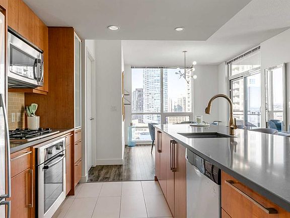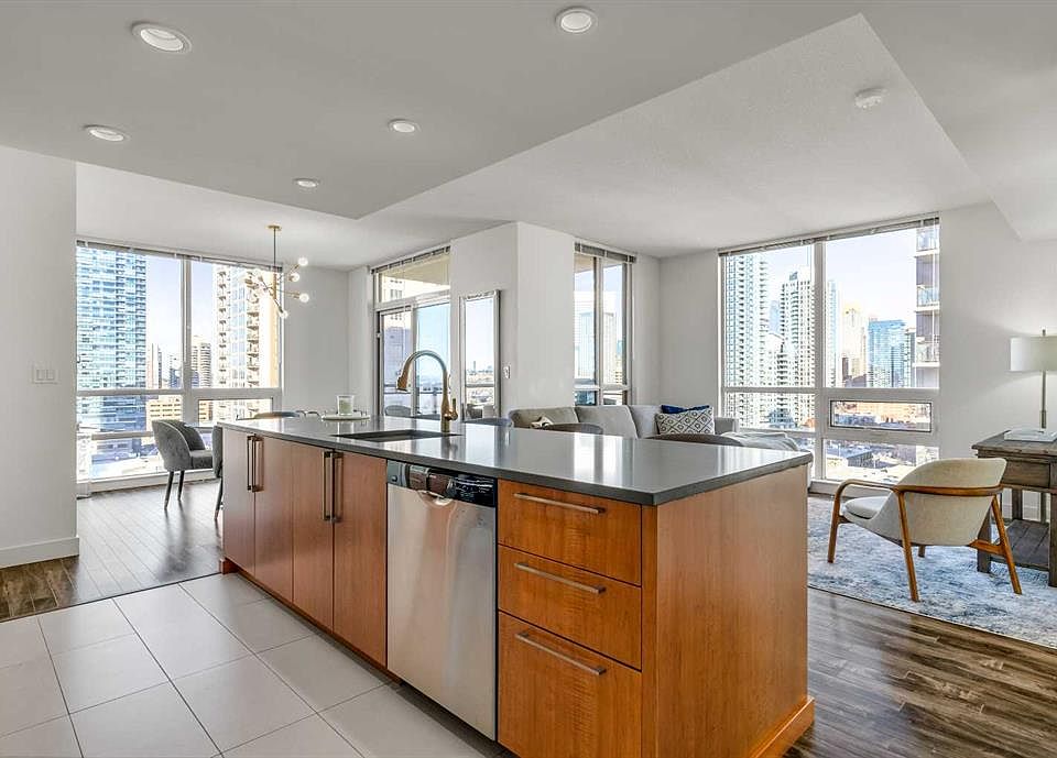 End unitExpansive floor-to-ceiling windowsSweeping city viewsOpen-concept living spacePrivate foyerCovered balconyGalley-style kitchen