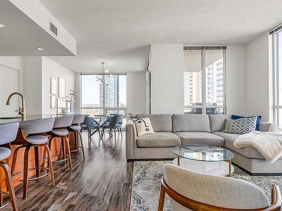 Impeccably designed and move-in ready, this stunning END UNIT in the heart of the BELTLINE offers a rare opportunity to purchase a FULLY FURNISHED home showcasing high-end pieces from POTTERY BARN and WEST ELM. Every item inside is included, creating a seamless, stylish, and effortless transition for the new owner. Expansive FLOOR-TO-CEILING WINDOWS frame sweeping CITY VIEWS, filling the open-concept living space with natural light. A PRIVATE FOYER introduces the thoughtfully designed layout, where the living room separates both bedrooms for OPTIMAL PRIVACY. The spacious living area invites relaxation with contemporary furnishings, while the dining room opens through patio sliders to a COVERED BALCONY, perfect for indoor-outdoor entertaining. A GALLEY-STYLE KITCHEN features FULL-HEIGHT CABINETRY, QUARTZ COUNTERTOPS, STAINLESS STEEL APPLIANCES, and a LARGE ISLAND with an EATING BAR that comfortably seats four. The PRIMARY BEDROOM offers a true retreat with a WALK-THROUGH CLOSET leading to a luxurious 5-PIECE ENSUITE complete with DUAL VANITY, STAND-UP SHOWER, and SOAKER TUB. A SECOND BEDROOM with DUAL CLOSETS connects to a 3-PIECE ENSUITE that doubles as a guest bath. Enjoy the convenience of IN-SUITE LAUNDRY, NEW WASHER & DRYER, and an oversized TITLED PARKING STALL located on P-1 (STALL #53). A separate ASSIGNED STORAGE LOCKER provides additional space for seasonal items. Step outside to a COVERED BALCONY with included PATIO FURNITURE and BBQ, all overlooking Calgary’s ever-evolving skyline. Building AMENITIES elevate daily life with a FULL-TIME CONCIERGE, FITNESS CENTRE with STEAM ROOM, PARTY ROOM/OWNERS LOUNGE, LANDSCAPED COURTYARD, RENTABLE GUEST SUITE, VISITOR PARKING, and SECURE BICYCLE STORAGE. Ideal for professionals, investors, or those seeking a low-maintenance urban lifestyle, this residence combines design sophistication with everyday functionality in one of Calgary’s most vibrant downtown communities.