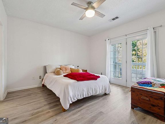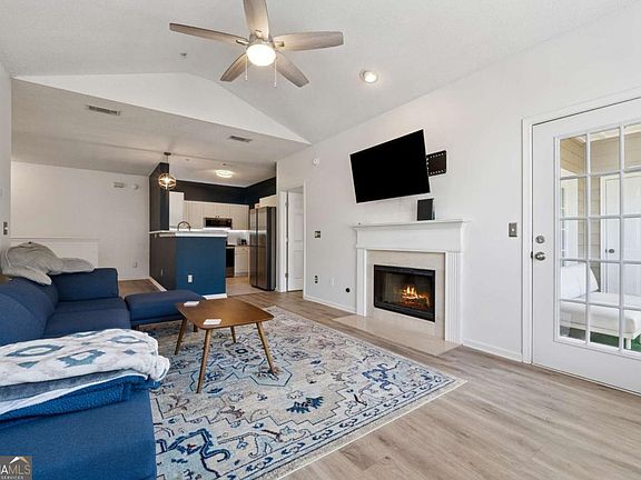 Welcome to your DREAM home nestled in the serene, gated Woodlands At Webb Bridge community. This beautifully updated condo sits in an unbeatable location, just steps from DOWNTOWN Alpharetta and AVALON. Enjoy upscale living at an affordable price in one of North Fulton's most sought-after neighborhoods! Thoughtful split-bedroom floor plan ensures privacy, with a PRIMARY suite featuring custom walk-in closets and romantic French doors opening to a private balcony. Newly installed hardwood-like floors, quartzite countertops, stylish backsplash, and stainless steel appliances create a sophisticated and inviting atmosphere. A NEWER HVAC unit and roof add peace of mind. The fireside family room flows seamlessly into an open-concept dining area and a sleek white kitchen with a breakfast bar, perfect for entertaining guests or COZY nights in. Savor morning coffee on the covered front porch or unwind on the PRIVATE balcony with tranquil wooded views. Additional storage off the patio keeps things organized. Enjoy GATED security, a clubhouse, sparkling pool, and pet-friendly walking paths, including a charming trail to Avalon. Perfect for those who love both city vibrancy and outdoor escapes. Includes a 1-car GARAGE, driveway, and ample unassigned parking spaces nearby for guests or roommates. Located just minutes from Avalon's upscale shopping, dining, and entertainment, and a short stroll to Downtown Alpharetta's vibrant farmer's market, concerts, and Alpha Loop trails, this condo offers the best of both worlds. Explore the nearby Greenway Trail for biking or hiking, or enjoy the quiet charm of this gated community with serene, wooded surroundings. With EASY access to GA-400, you're perfectly positioned for work or play. This meticulously maintained condo is move-in ready, offering affordable luxury with modern upgrades and low-maintenance living. Ideal for professionals, small families, or roommates, it's a rare opportunity to own in a prime Alpharetta location. Don't miss your chance to experience the perfect balance of urban excitement and suburban tranquility!