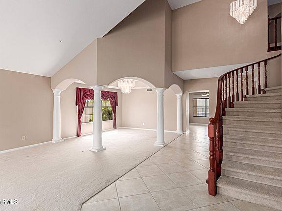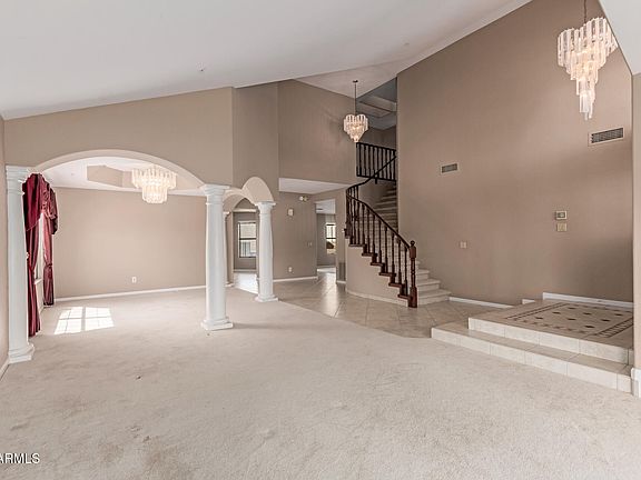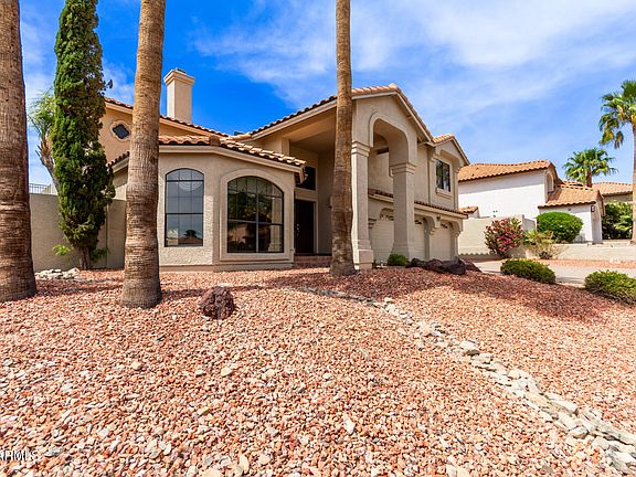 Wow! Incredible 4-bedroom residence ready to go with a great curb appeal! The exquisite interior offers Roman pillars in the formal dining, elegant chandeliers, a sunny bay window in the living room & carpet/tile floors. The bright family room has a fireplace, powder room, & wet bar for intimate gatherings. The gourmet kitchen boasts SS GE Profile appliances, ample counters, plenty of cabinets, an island w/breakfast bar, & recessed lighting. Oversized main suite highlights a fireplace, wet bar, two French doors to a balcony, & full bathroom w/mirrored door walk-in closet. Entertainer's backyard features a full-length covered patio, paved seating area, putting green & artificial turf (installed 3 years ago), & L-shaped fully tiled pool with a bridge and water features. Use the spiral staircase or exit from the master suite through the two double doors to the deck and enjoy the unobstructed sunsets and views of Camelback mountain. This home also has a spacious garage w/cabinetry for extra storage, EV charger in the garage, epoxy floor and work area. Roof replaced in 2021. Located close to award winning schools, outdoor activities and the Mayo Clinic. This home really has it all!