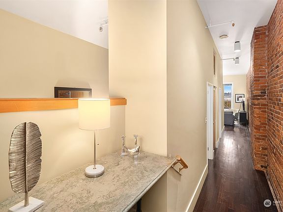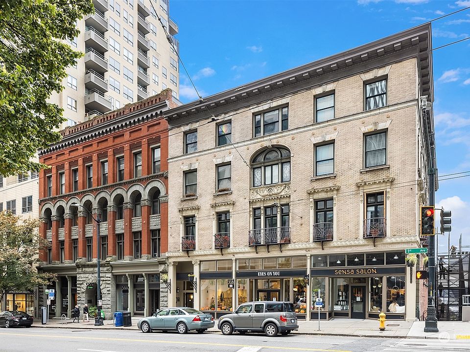 Stylish living in this historic brick building in an outstanding downtown location. West-facing 1 bedroom end unit with brick walls, 10+ ft ceilings, wood floors, open and airy great room - even a view of Elliott Bay. Mere moments to Pike Place Market, Pioneer Square shops, SAM and ferries to the islands. New roof installed, new atrium skylights, new windows in process to ensure the next 100 years. HOA in good financial health with more upgrades planned. Currently no wait list for long-term rentals. Affordable downtown living one block from the new Alaskan Way Waterfront & just as it starts coming to life.