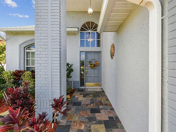 Stacked-stone fireplaceFarmhouse-style sinkModern interior updatesScreened lanaiMature palm treesNew roofUpdated lighting