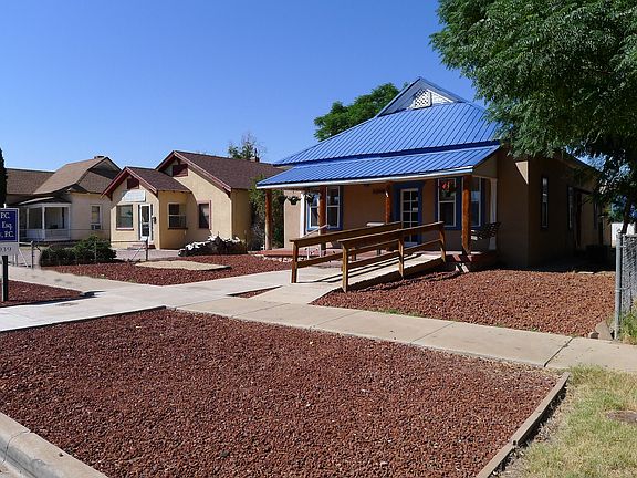 Vintage Adobe Property has roomy office space. Just 1 1/2 blocks off 10th Street. Four large rooms for offices plus kitchenette & full bath. Three exterior doors for separate entrances. Offered mostly furnished. Large storage building in the back, fenced yard. Cellar space also. Charming adobe exterior, blue metal roof & front porch. Property is leased to law offices now. Owner finance offered to qualified buyer. Zoned C-1